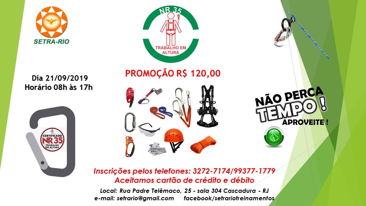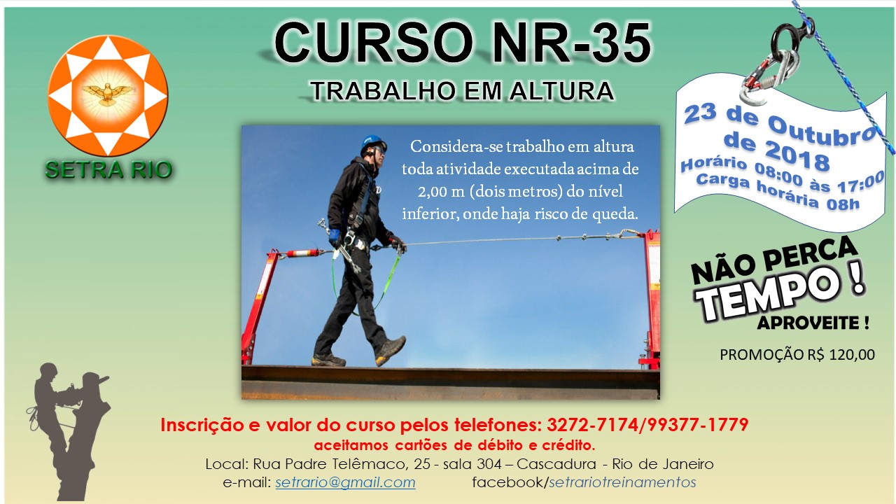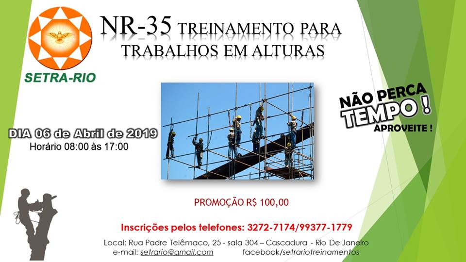 Estaremos realizando na data de 06/04/2019 (sábado), o treinamento de NR-35 - Segurança para Trabalhos em Alturas, com início às 08:00h.